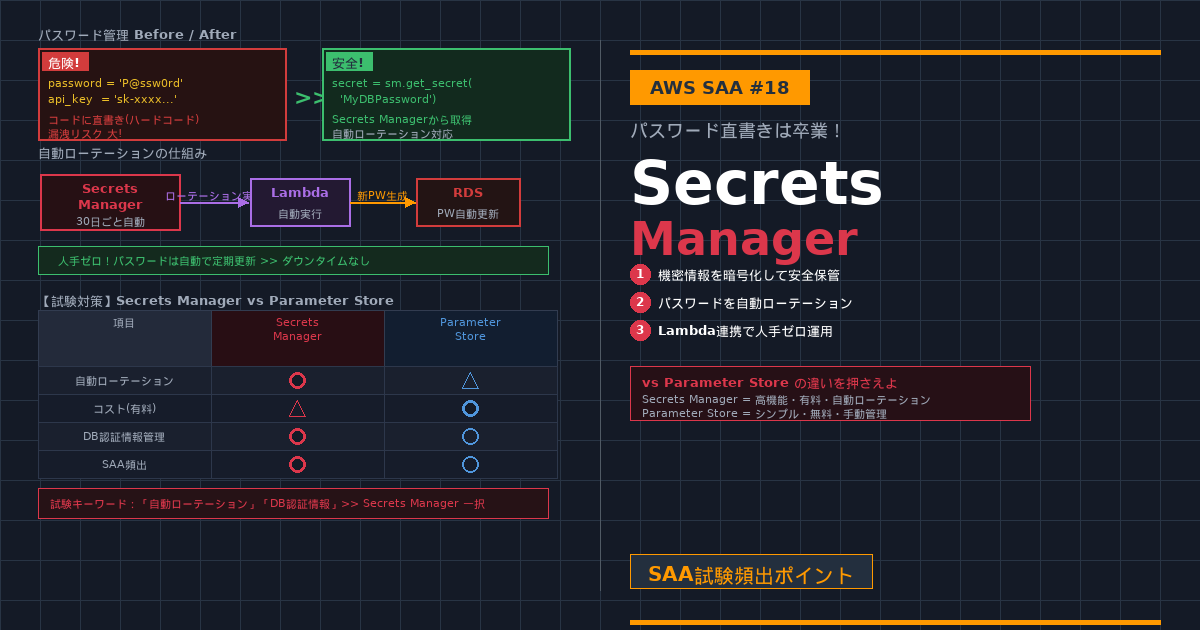 「秘密は覚えるな、Secrets Managerに預けろ。Lamdaが勝手にパスワードを磨き(更新)、漏洩リスクを最小化する!」
