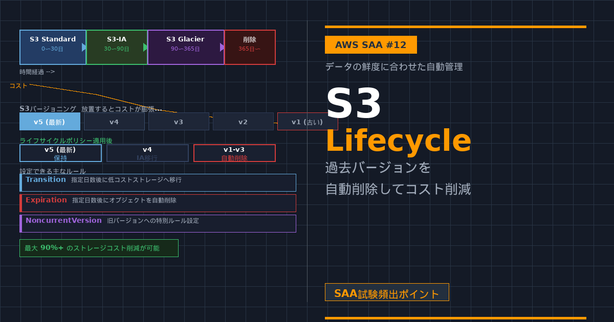 | 移行(Transition) | 安いストレージクラスへ移動 | コスト削減(標準 → IA → Glacier) |